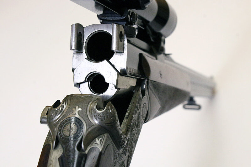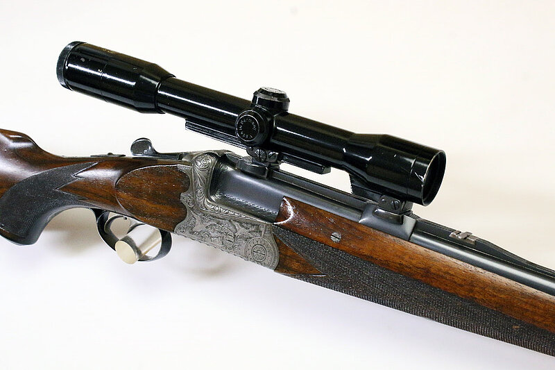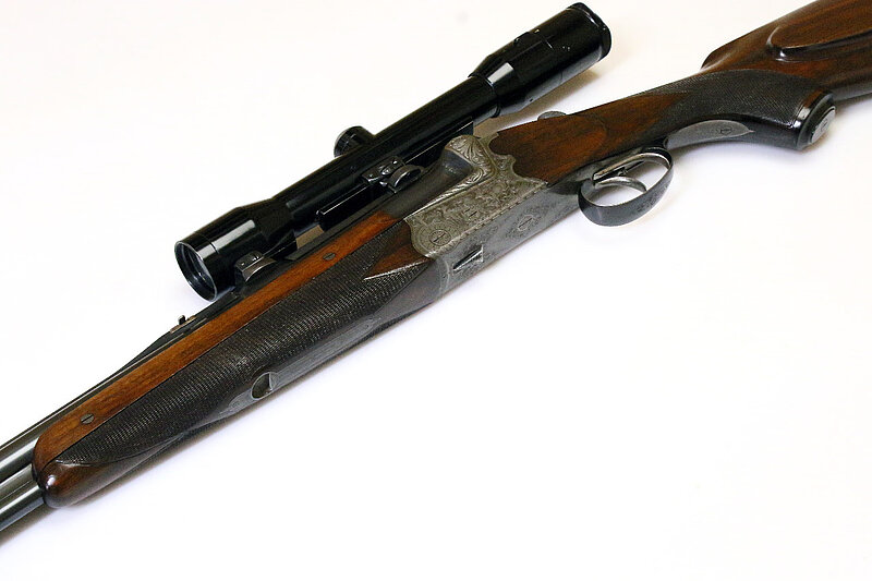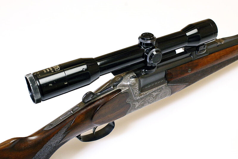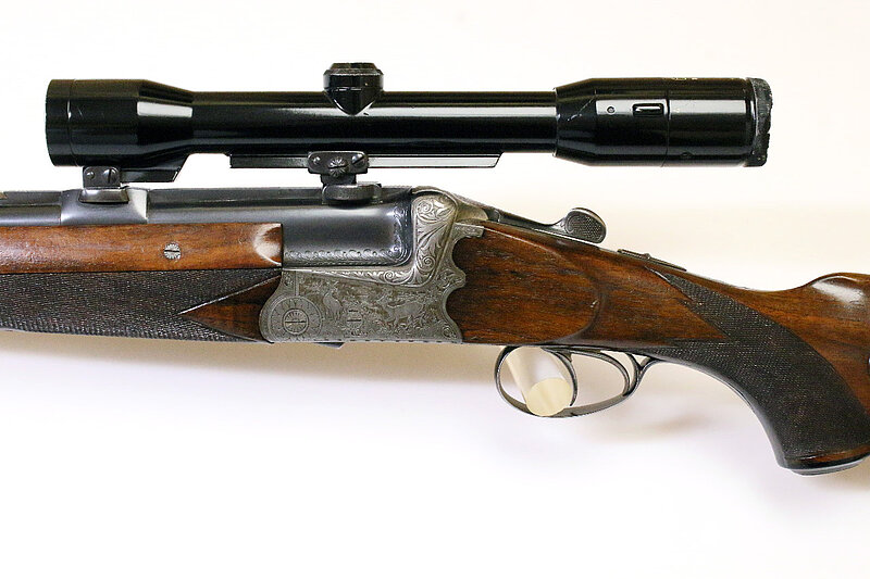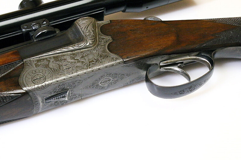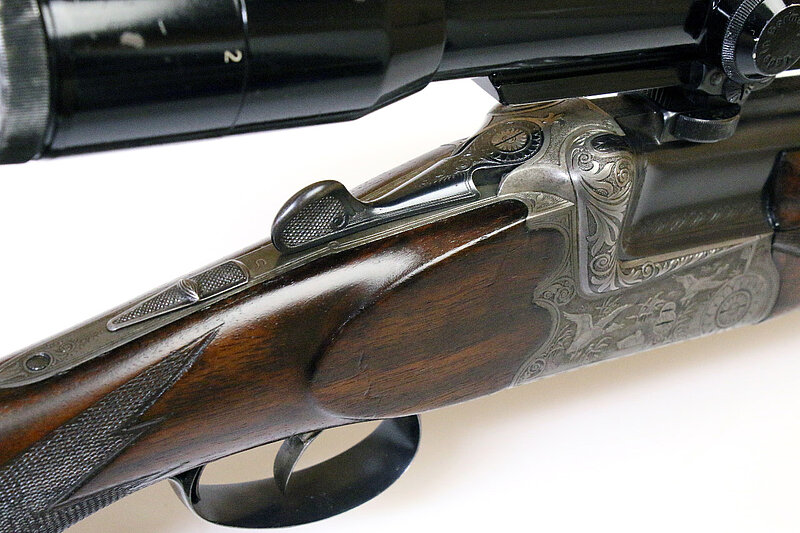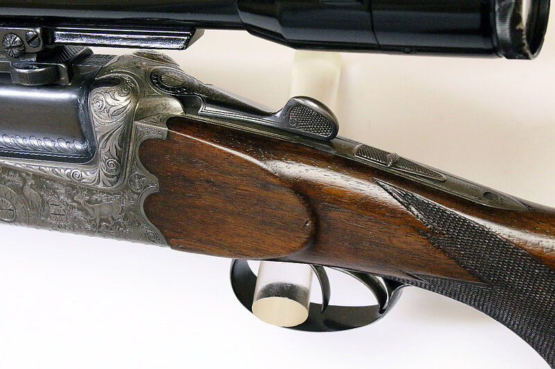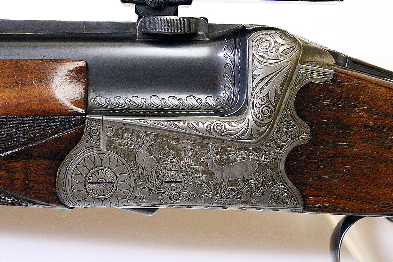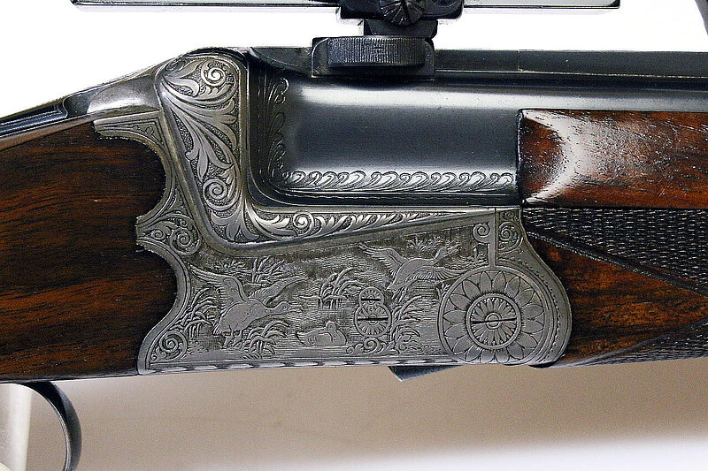 Stahlbasküle beidseitig mit feinen Wildstücken (Enten & Reh mit Rehbock) graviert, umrahmt von Rocaillen/Arabesken sowie div. anderen Mustern, Unterseite en suite, Kolbenhalssicherung, Rückstecher, Kerstenverschluss mit Doppelhakenverriegelung