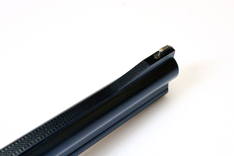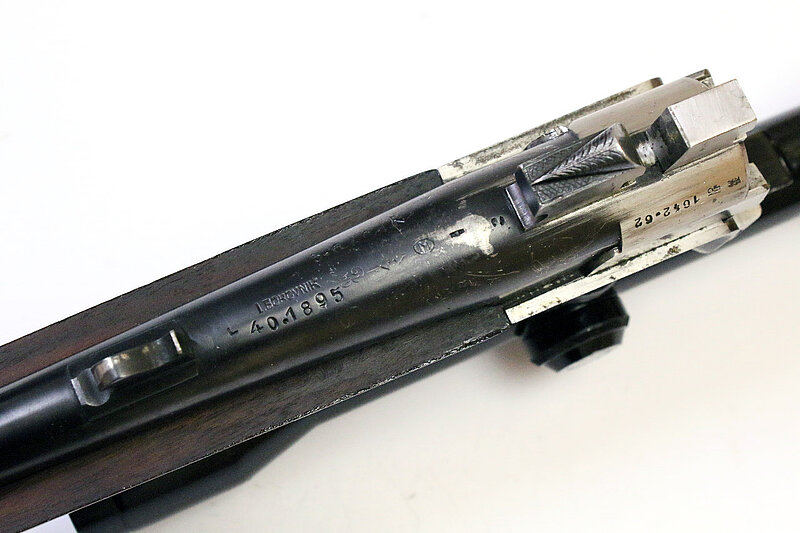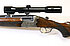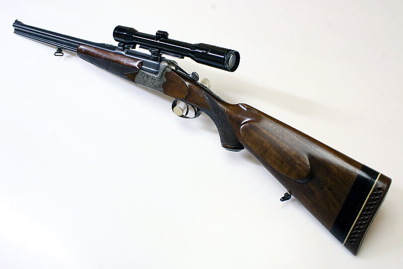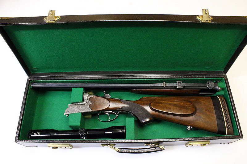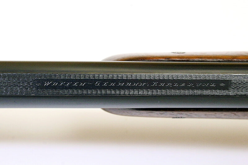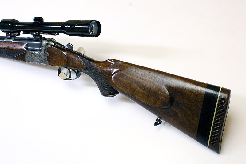 Nussholzschäftung, gummierte Schaftkappe, deutsche Backe, feiner Fischhautverschnitt am Griff & Vorderschaft, Riemenbügel