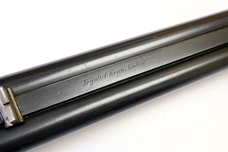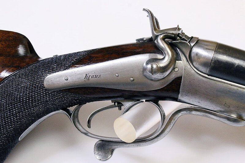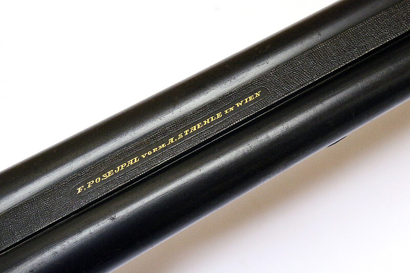 Laufbündel mit leicht konischer, bis zur eingeschobenen Kimme guillochierter Laufschiene; darin in Kartusche, goldtauschiert bez. "J.POSEJPAL vorm. A.STAEHLE in WIEN"; nach Kimme bez. "Regulirt Kraus Loeben", eingeschobene Kimme, Auszieher