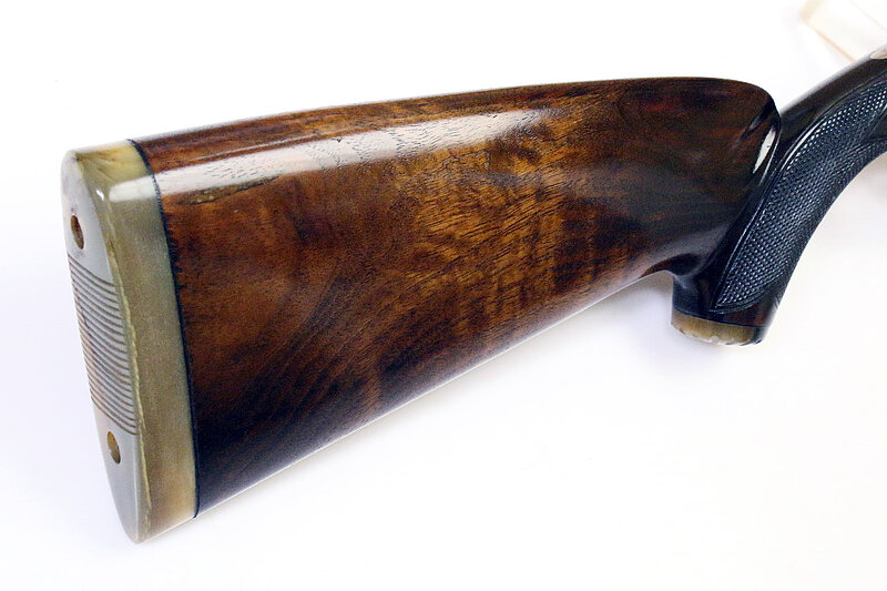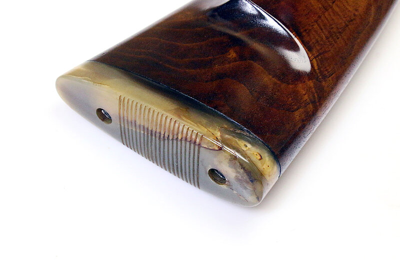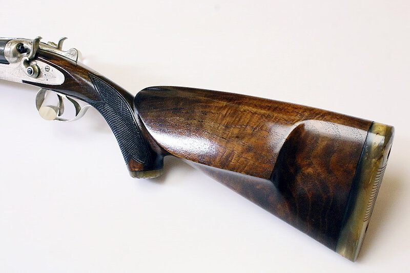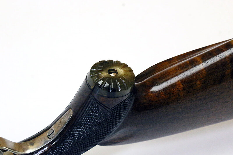 schöner Nussholzschaft, Schaftkappe & Griffkolbenkappe aus Horn, feiner Fischhautverschnitt an Schaft & Vorderschaft, bayrische Backe, Riemenbügel