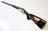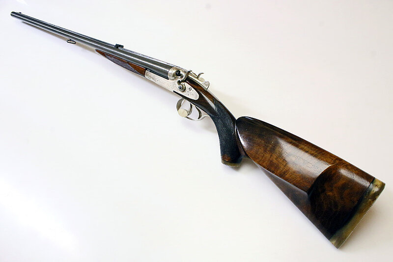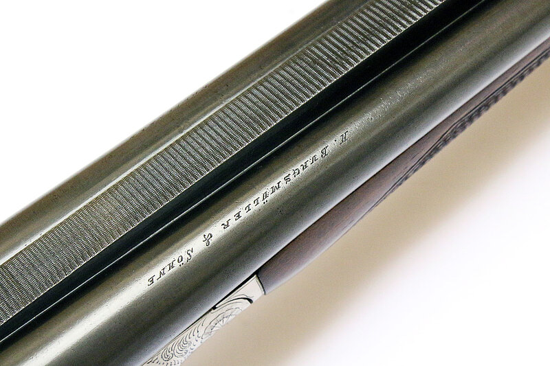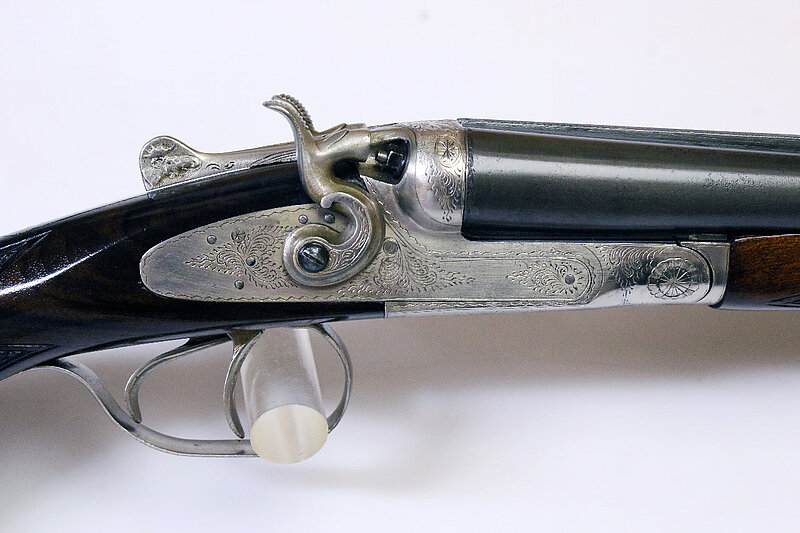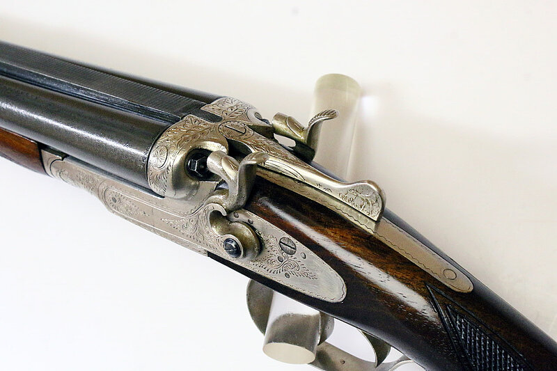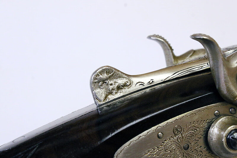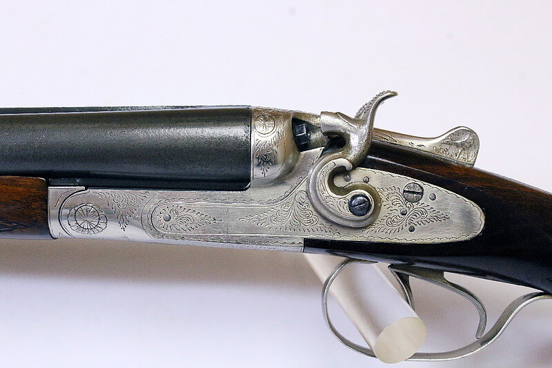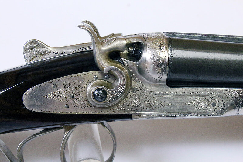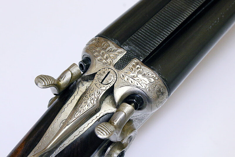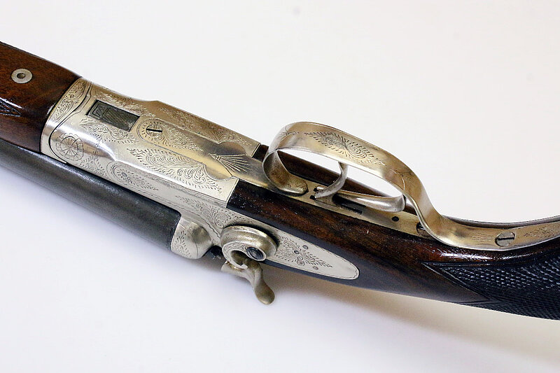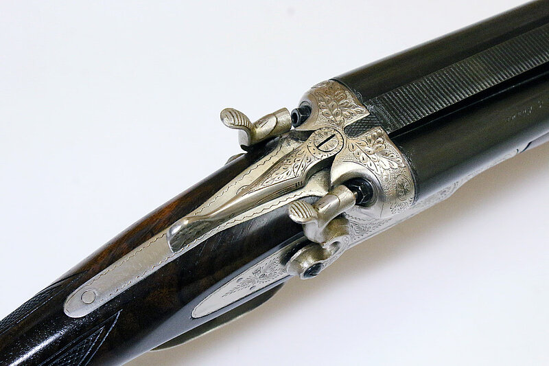 vernickelte Stahlbasküle, dreiseitig mit Arabesken/Rocaillen graviert, Oberseite mit Eichenlaubdekor, Verschlusshebel verziert mit kleinen Wildstücken (wohl Elchkopf & Reh), Greener-Verschluss mit Doppelhakenverriegelung