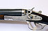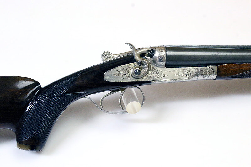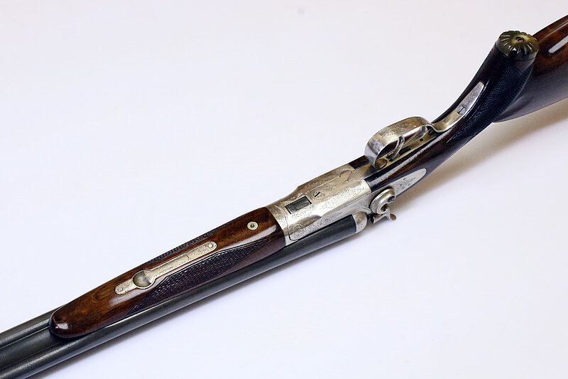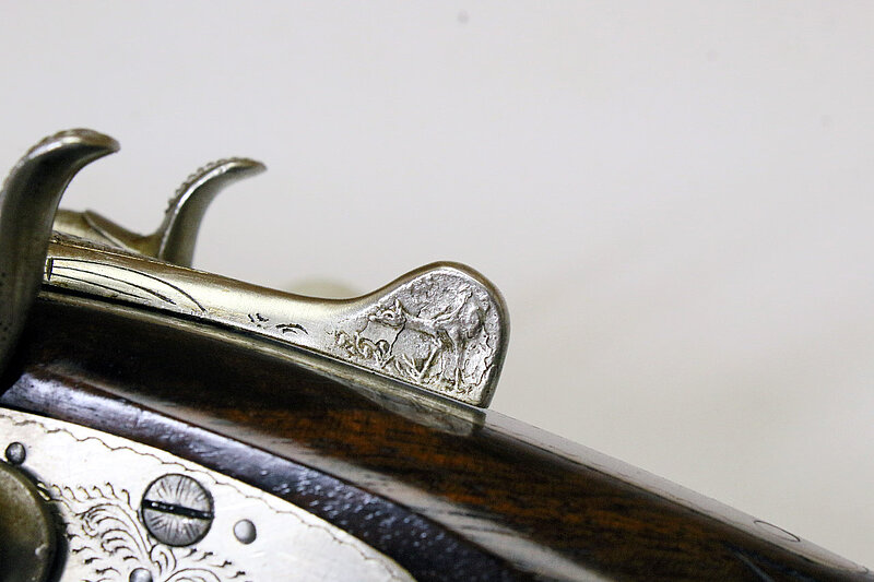Stahlbasküle beidseitig mit Wildstücken (Hirschkuh & röhrender Hirsch) graviert, flächendeckend umrahmt von div. Mustern, Laufselektion am Kolbenhals, Sicherung linksseitig, Greener-Verschluss mit Doppelhakenverriegelung, Rückstecher