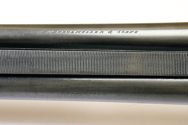 Laufbündel aus Böhler-Blitzstahl mit konischer, fein wellenförmig-guillochierter Laufschiene; in Kartusche bez. "Karl Burgsmüller Sen. Kreiensen"; eingeschobene mechanische Kimme, wechselbares Korn; Auszieher