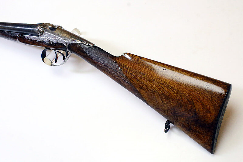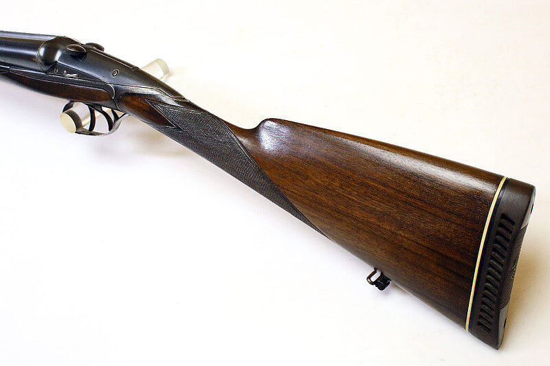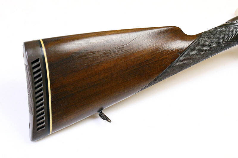 Nussholzschaft mit gummierter Schaftkappe, feinem Fischhautverschnitt am Griff & Vorderschaft, Riemenbügel