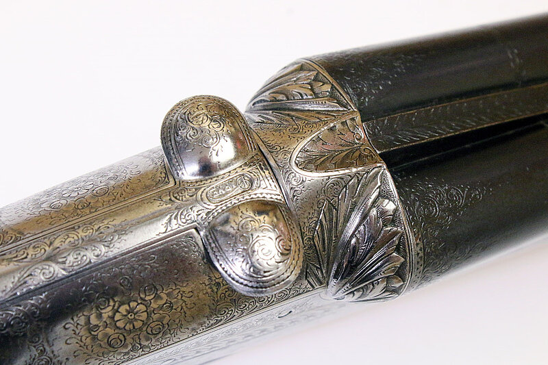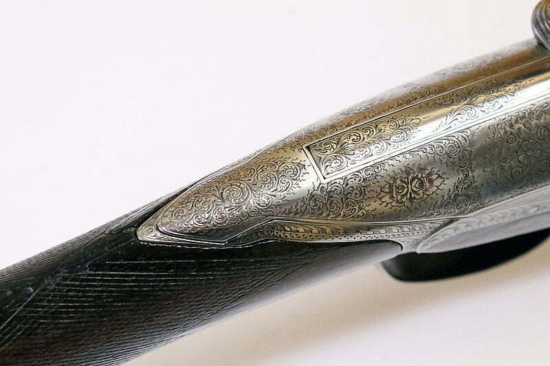 typische Darne-Gleitverschlussystem flächendeckend mit floralen Dekor graviert, Verschlusshebel bez. "DARNE", Garnitur en suite, Druckknopf auf der Unterseite zum Abnehmen des Laufbündels, Waffe schließt perfekt und spiellos