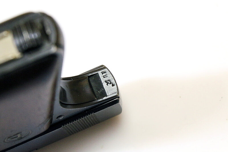Brünierung 1- (leichte Gebrauchs- & Altersspuren; der Kantenabrieb links am Schlitten mit minimalen Korrosionsansätzen)