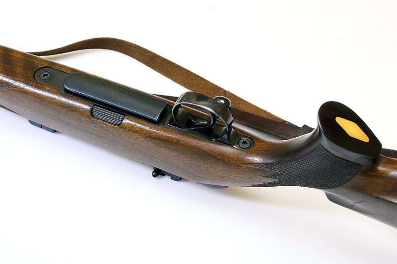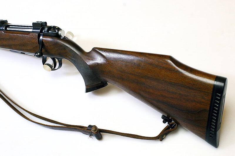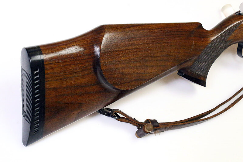Nussholz-Linksschaft, gummierter Schaftkappe, Monte Carlo Backe, Fischhautverschnitt am Griff & Vorderschaft, Griffkolbenkappe mit Beineinlage, Griffkolbenkappe & Tropfnase mit dunklem Edelholz abgesetzt, Trageriemen