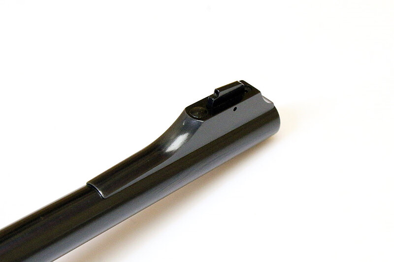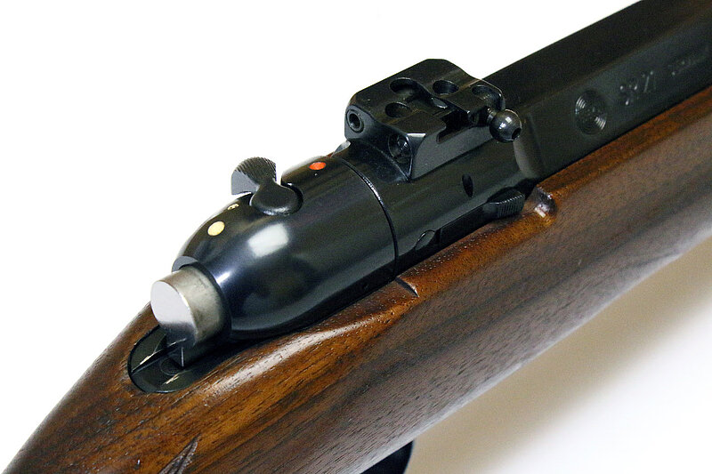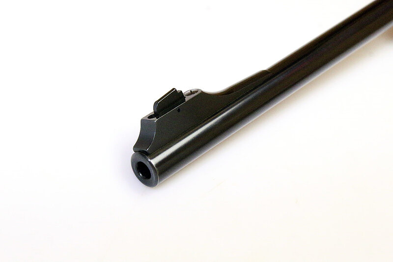 Laufbündel mit fein-wellenförmig guillochierter Laufschiene, darauf in Kartusche Modellbezeichnung & Firmierung; eingeschobene Kimme (Blatt demontiert, nicht beiliegend), wechselbares Korn; Auszieher