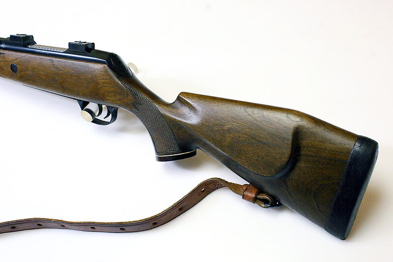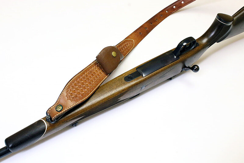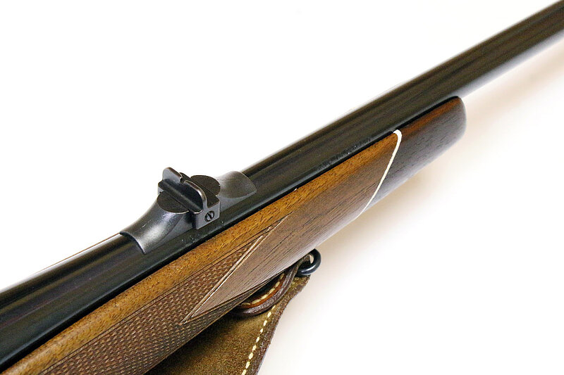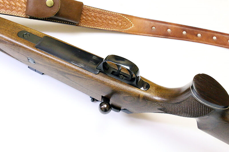 Nussholzschaft, gummierte / belederte Schaftkappe, Monte Carlo Backe, Fischhautverschnitt an Griff & Vorderschaft, Griffkolbenkappe & Schaftnase abgesetzt mit Edelholz, Trageriemen mit Täschchen
