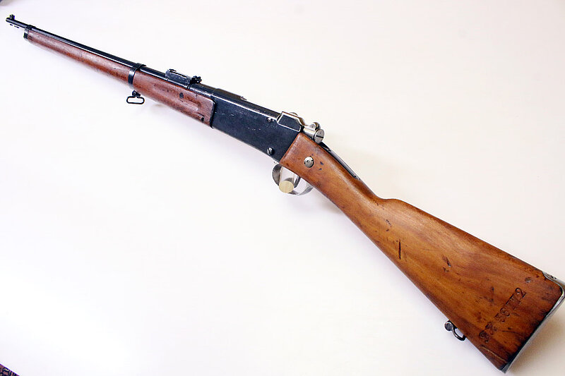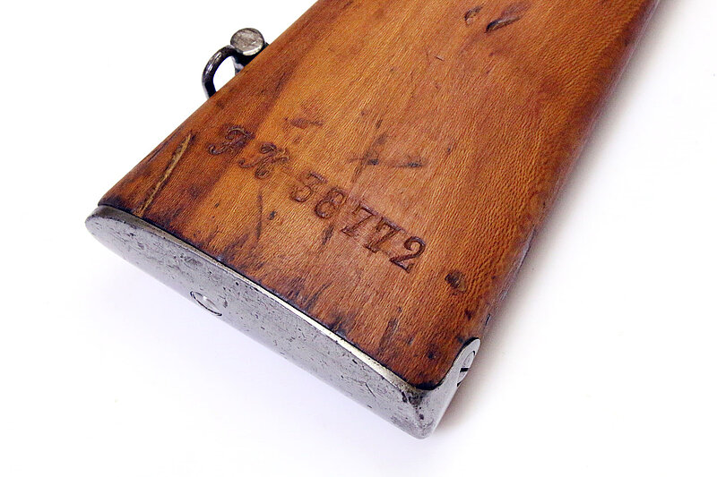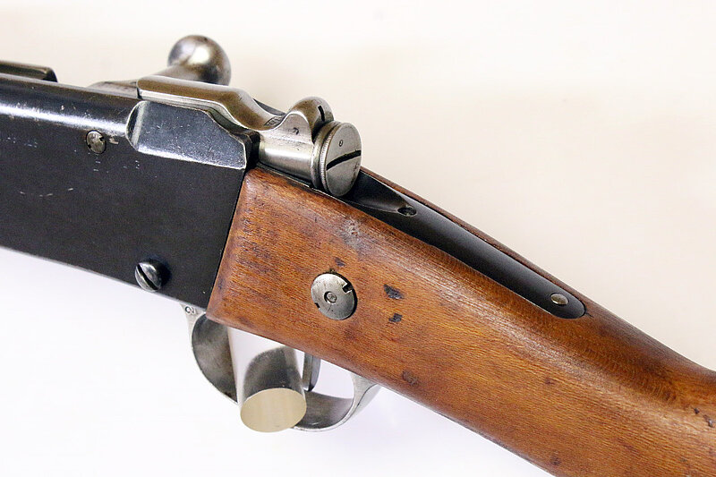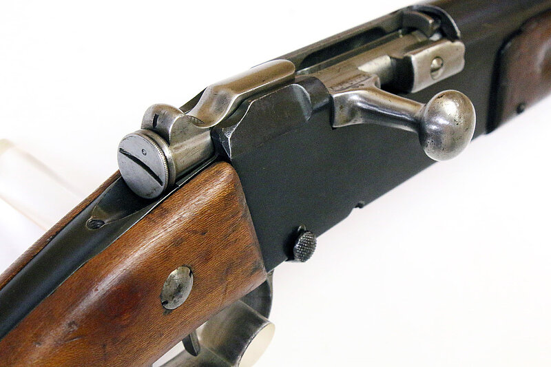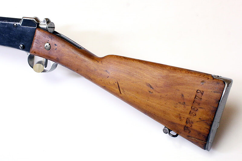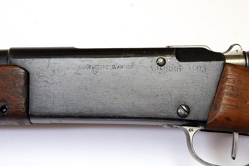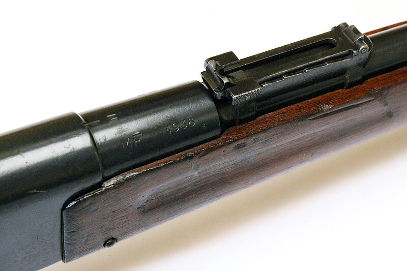 Laufwurzel rechts mit Herstellungsdatum und Laufhersteller gest. "MF 1936" > Manufacture Française d’Armes et Cycles 1936; links u.a. Kürzel des Stahlzulieferers "PF" > wohl für Pont-à-Foussemagne; Oberseite gest. "N" für Nouvelle Cartouche