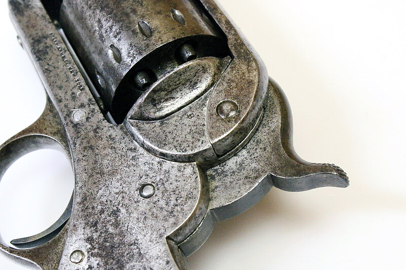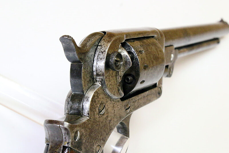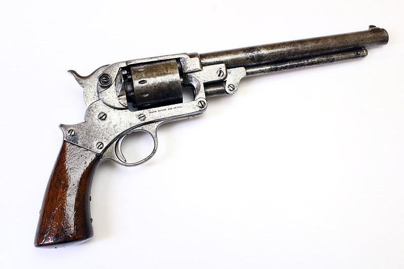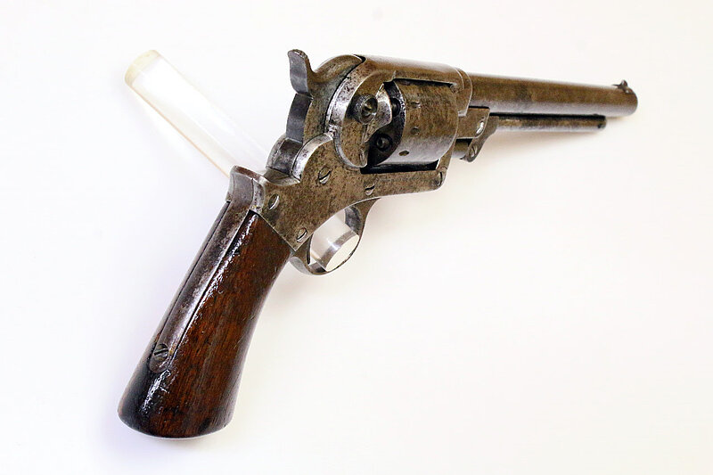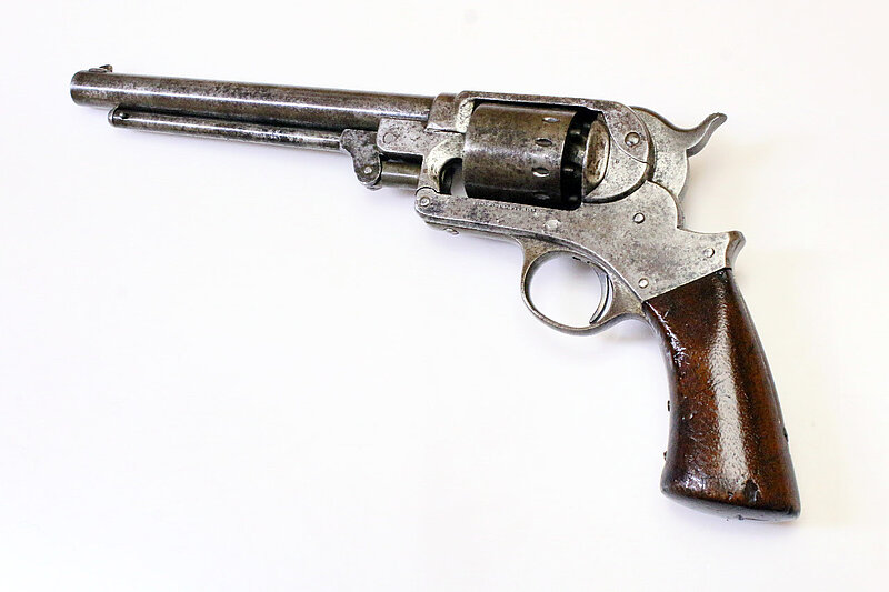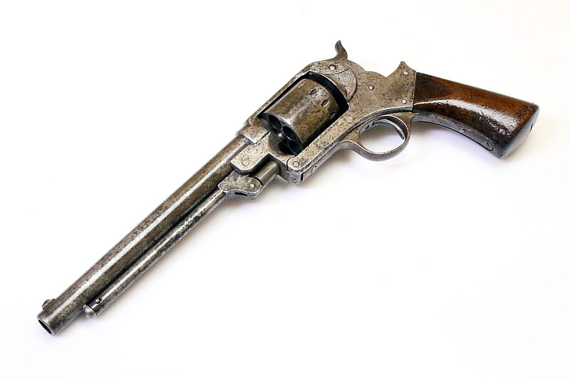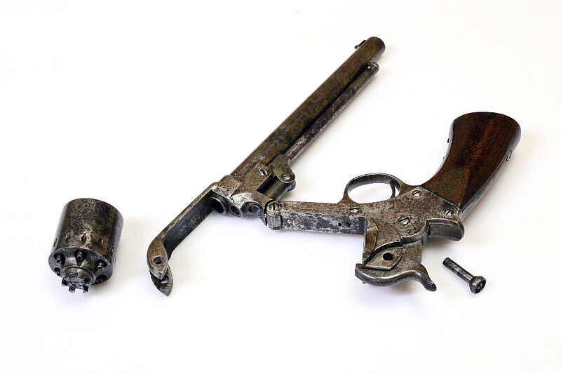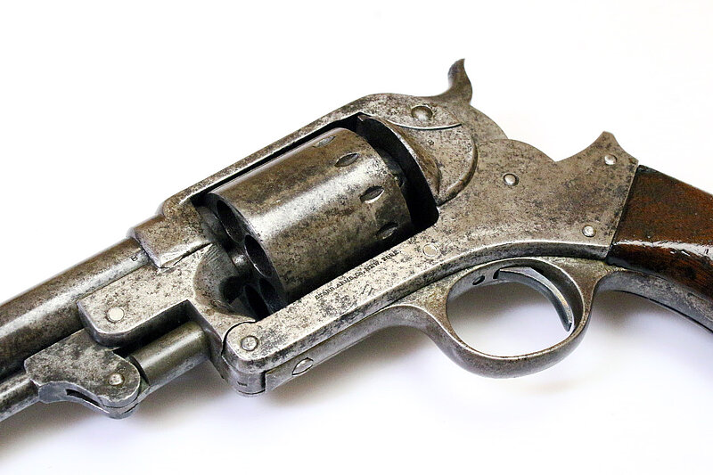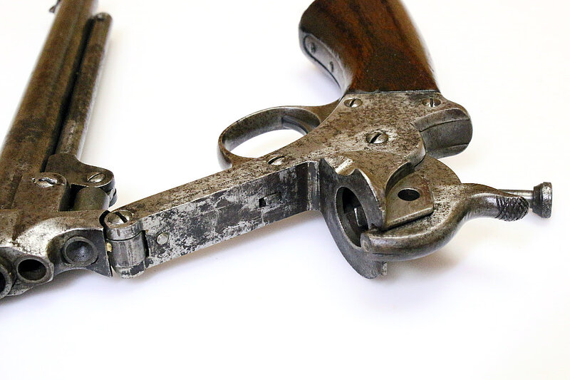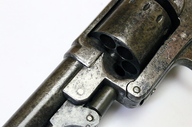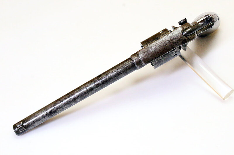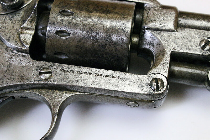 Anmerkung: Einzigartiges Revolverdesign von Ebenezer Townsend Starr aus Yonkers (New York) von 1856. Seiner Zeit voraus, verfügt dieser Revolver bereits über einen Kipplauf und ein innovatives Double Action System.