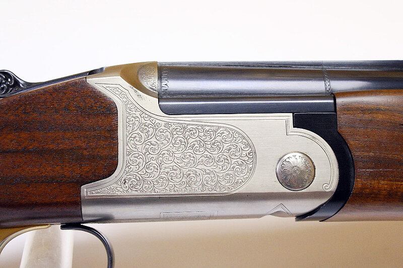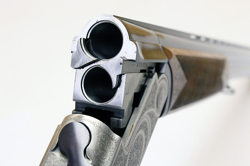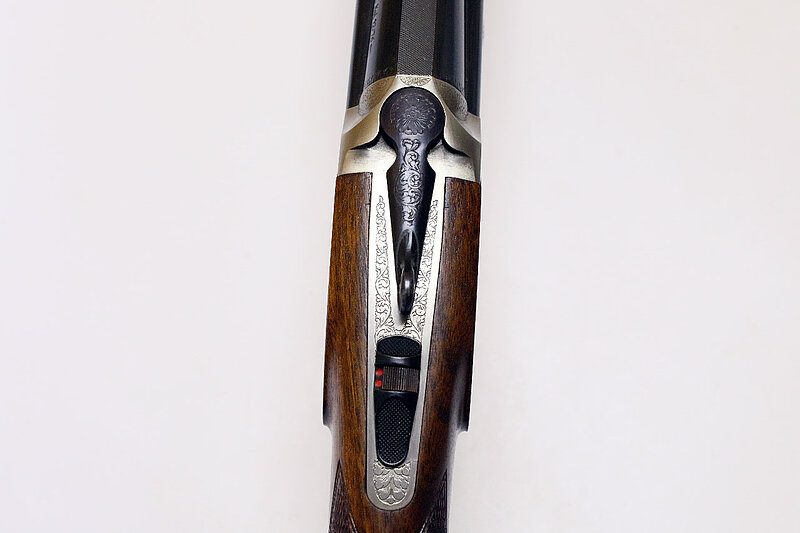 wohl vernickelte Stahlbasküle, Seitenplatten mit feinen Arabesken/Rocaillen graviert; Unterseite en suite geschnitten mit floralem Bouquet; Hahnschlosse einwandfrei; Doppelhakenverriegelung, Doppelzüngelabzug