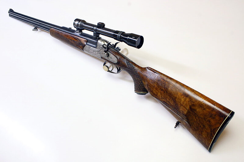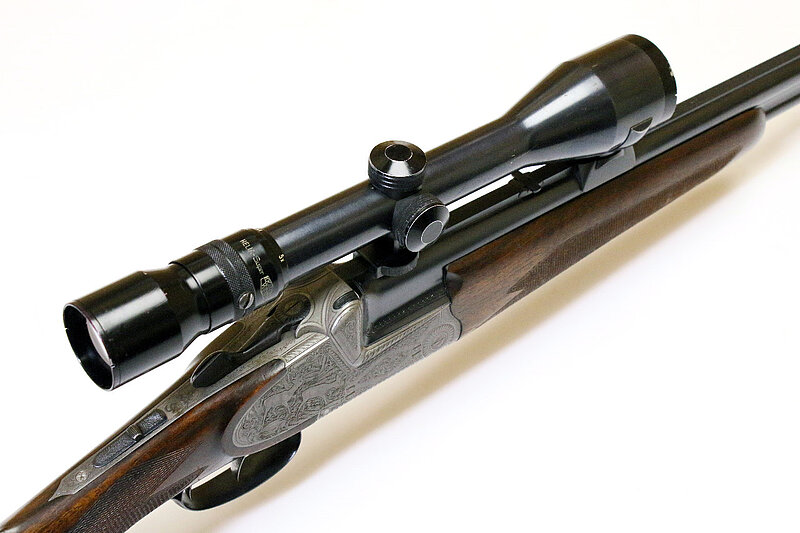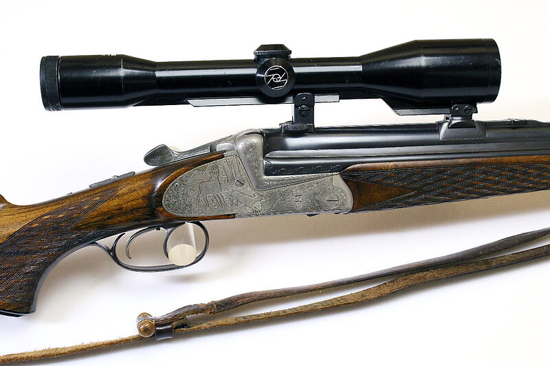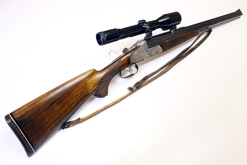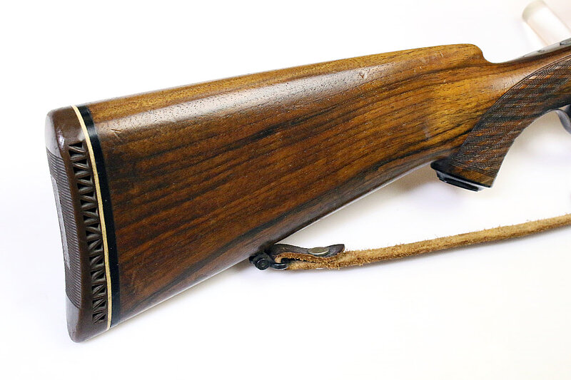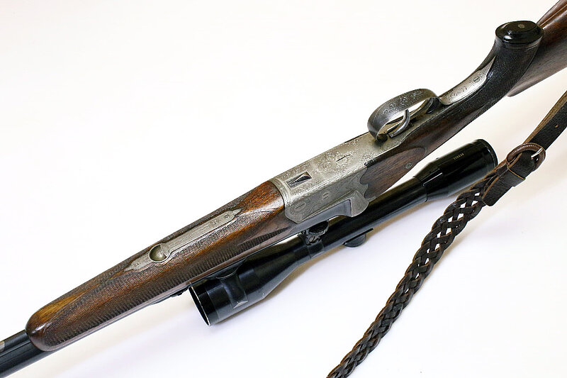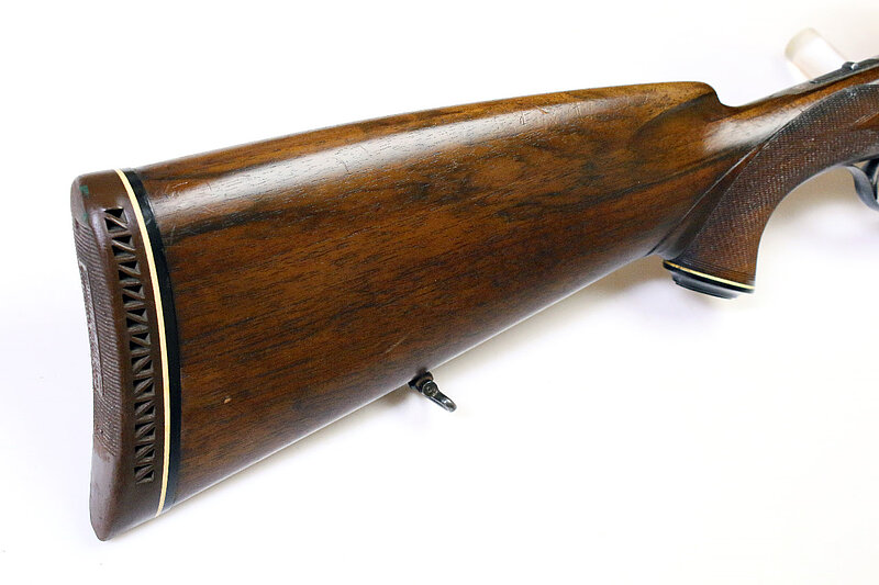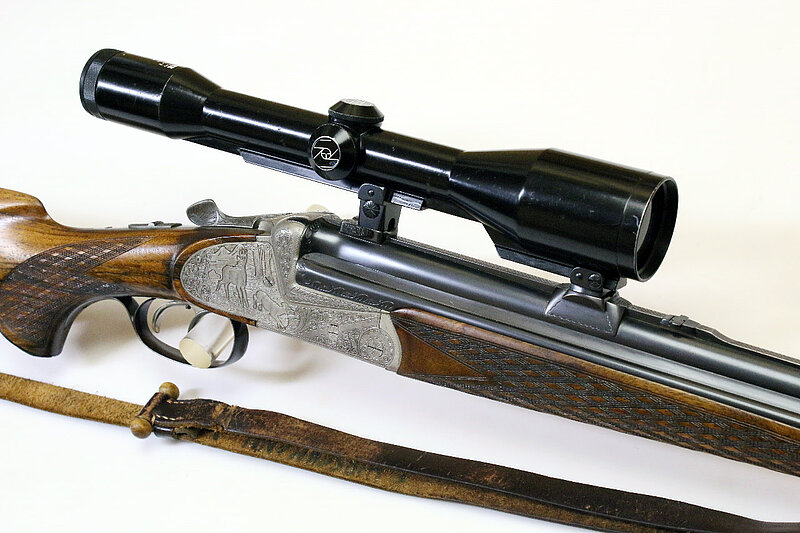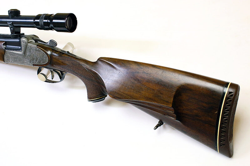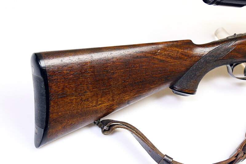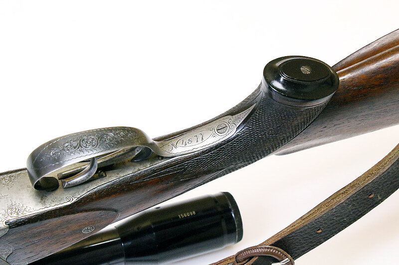 Nussholzschaft, gummierte Schaftkappe, bayrische Backe mit Doppelfalz, schottischer Fischhautverschnitt am Griff & Vorderschaft, Trageriemen