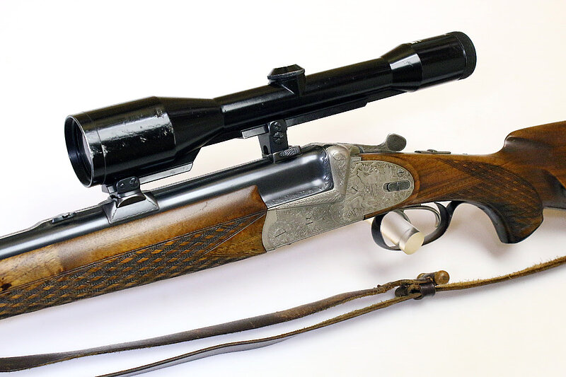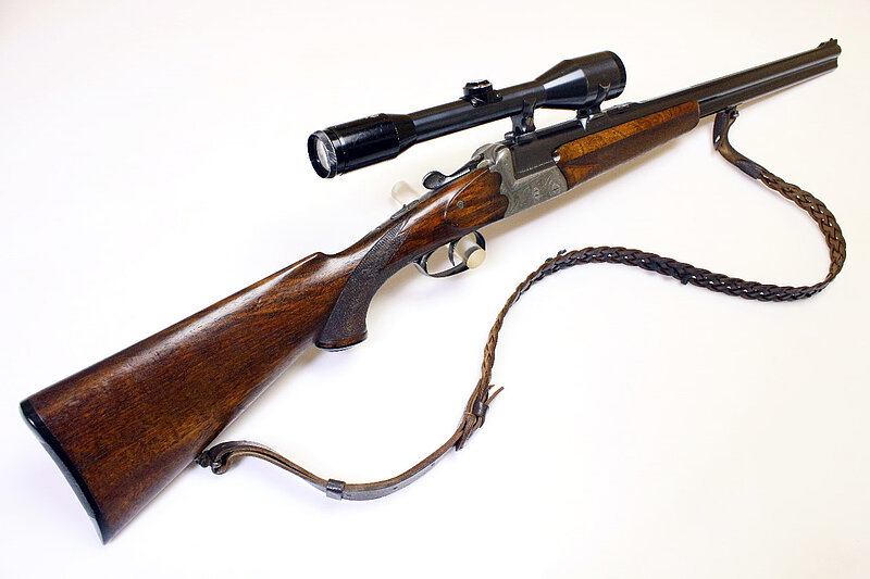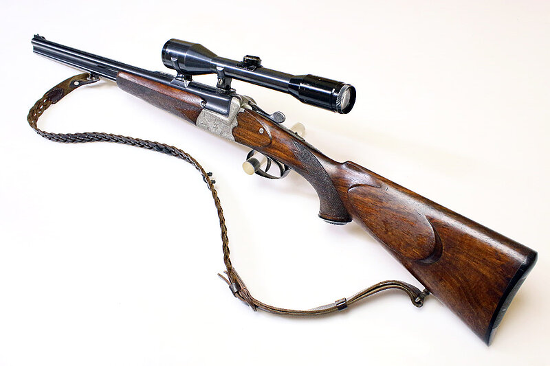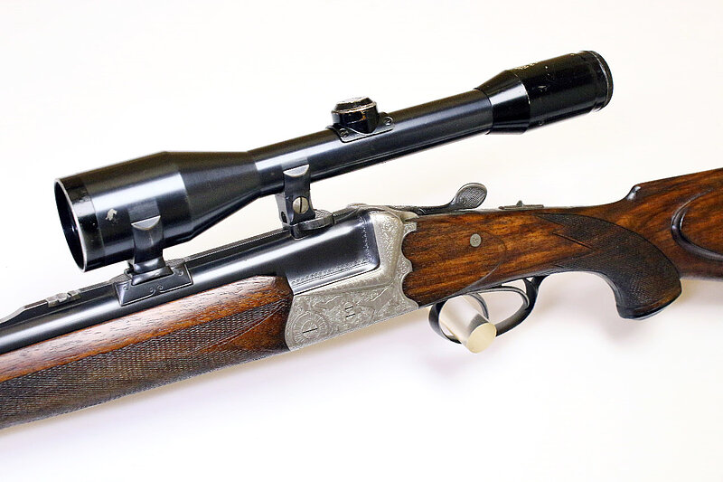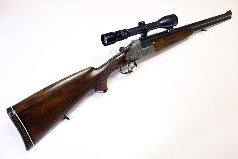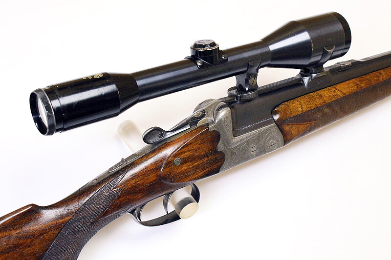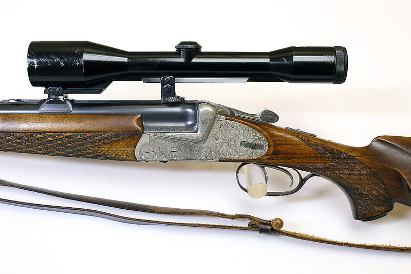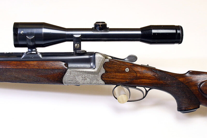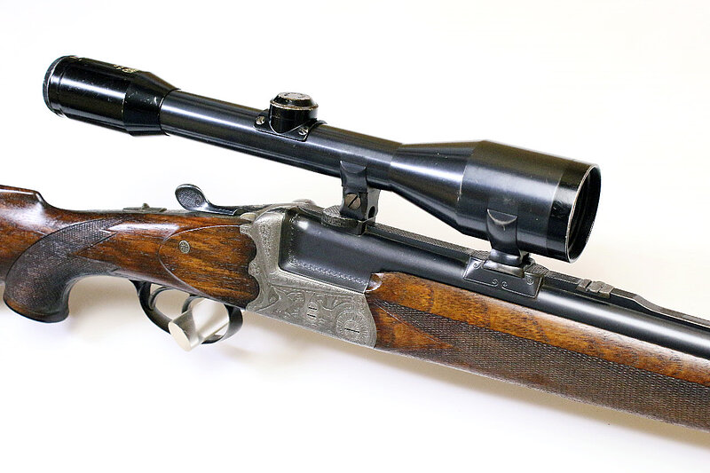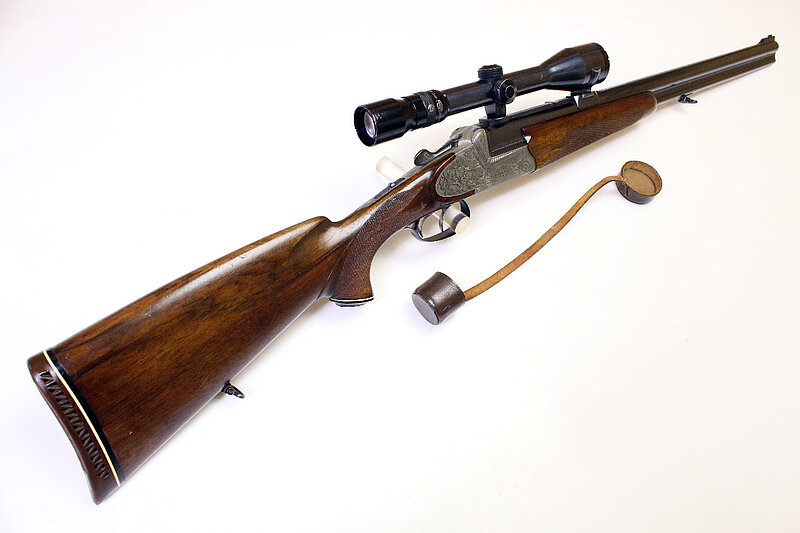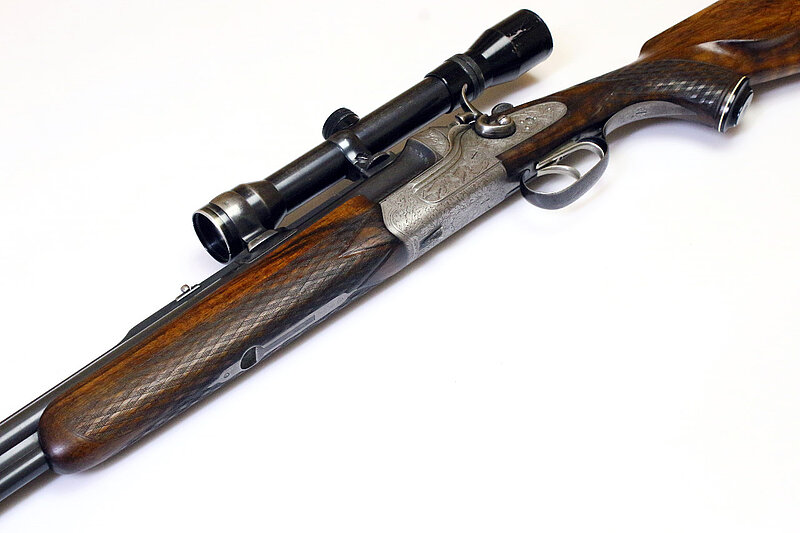 Nussholzschaft, gummierte Schaftkappe, bayrische Backe mit Doppelfalz, schottischer Fischhautverschnitt am Griff & Vorderschaft, Trageriemen