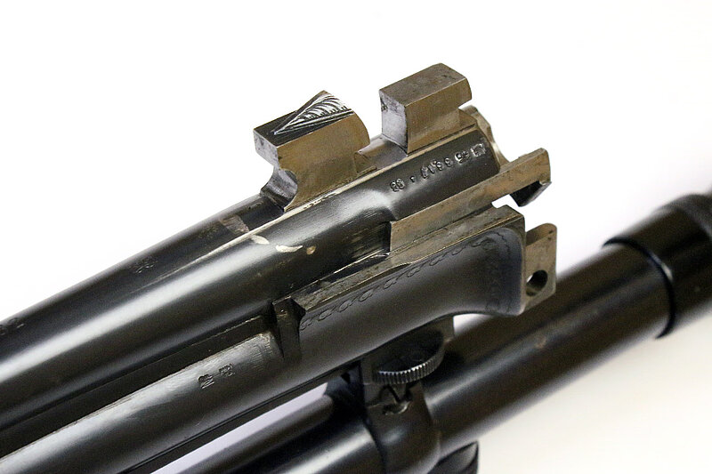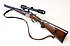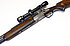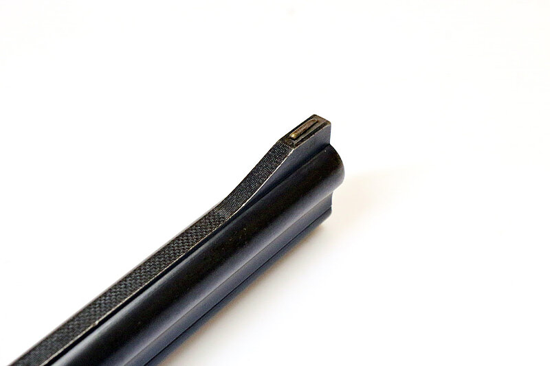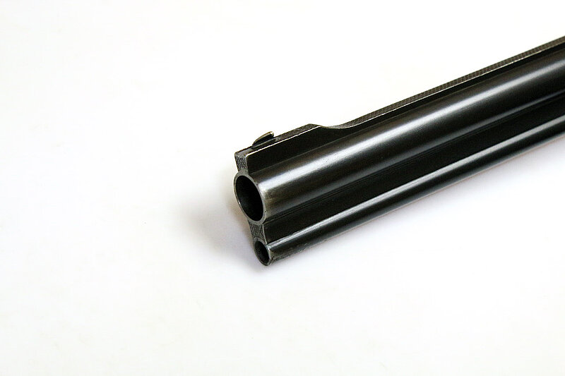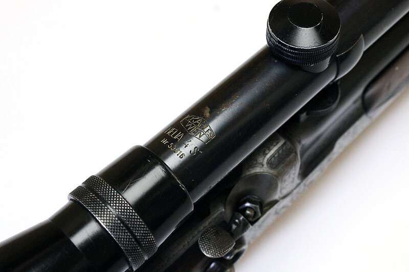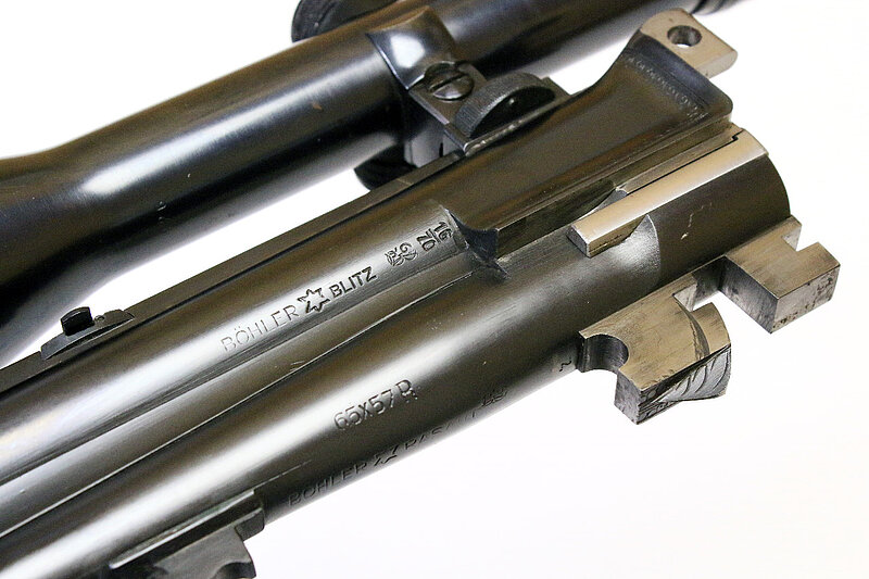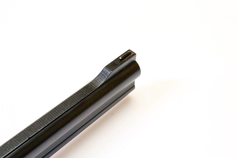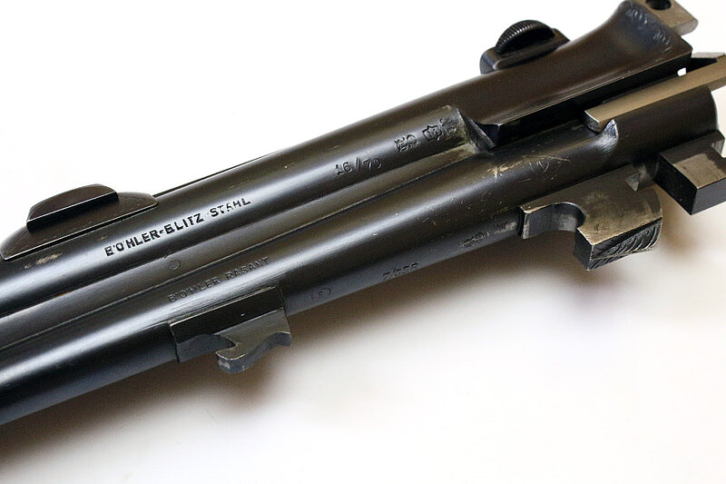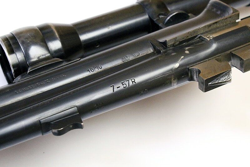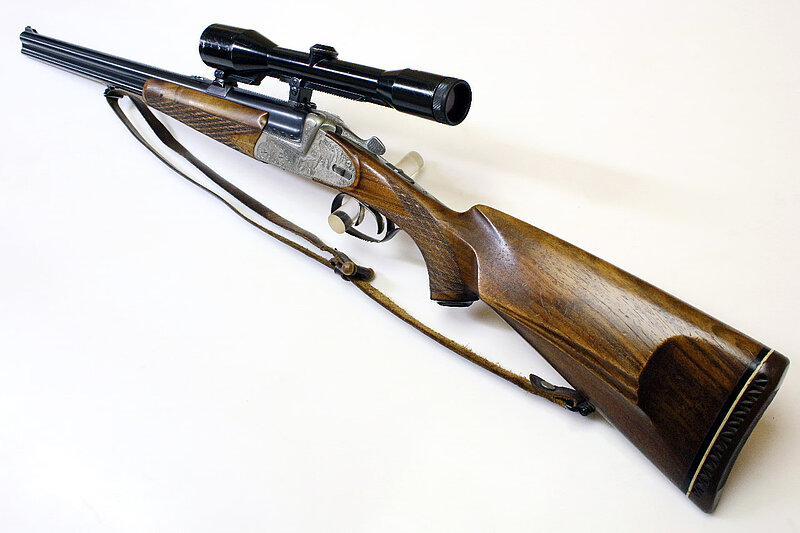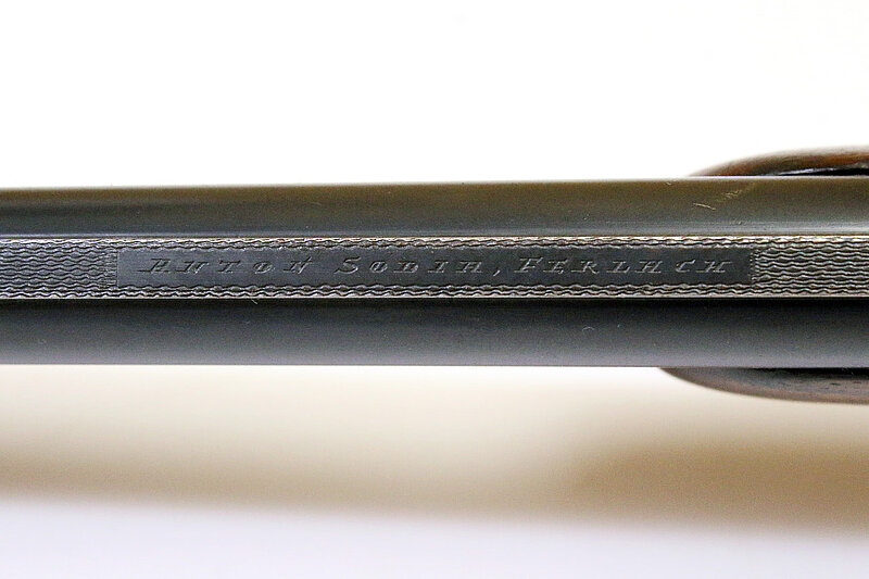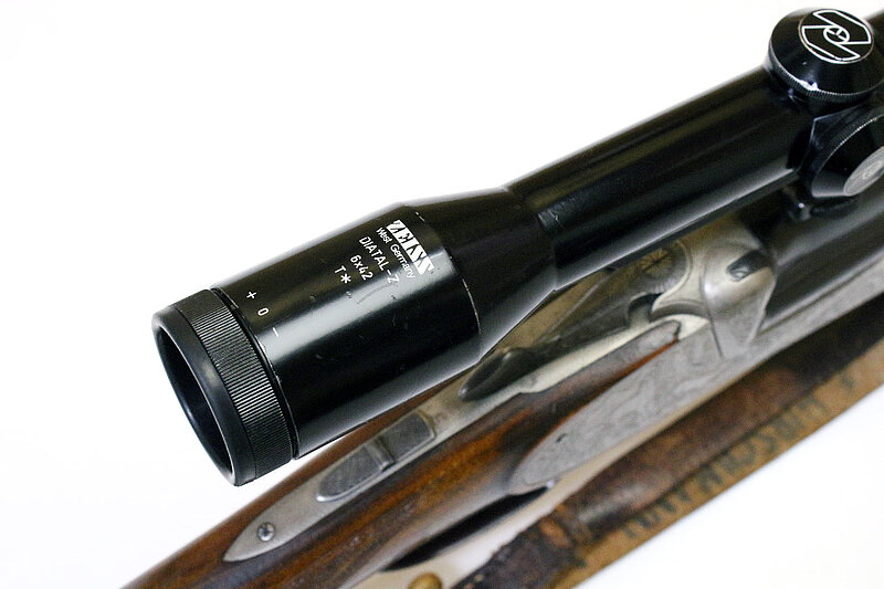 Nussholzschaft, gummierte Schaftkappe, bayrische Backe mit Doppelfalz, schottischer Fischhautverschnitt am Griff & Vorderschaft, Trageriemen