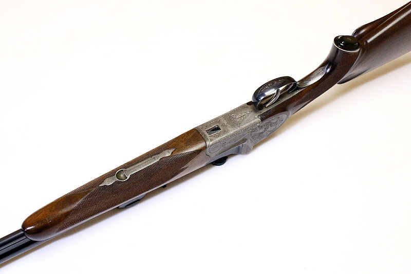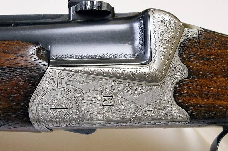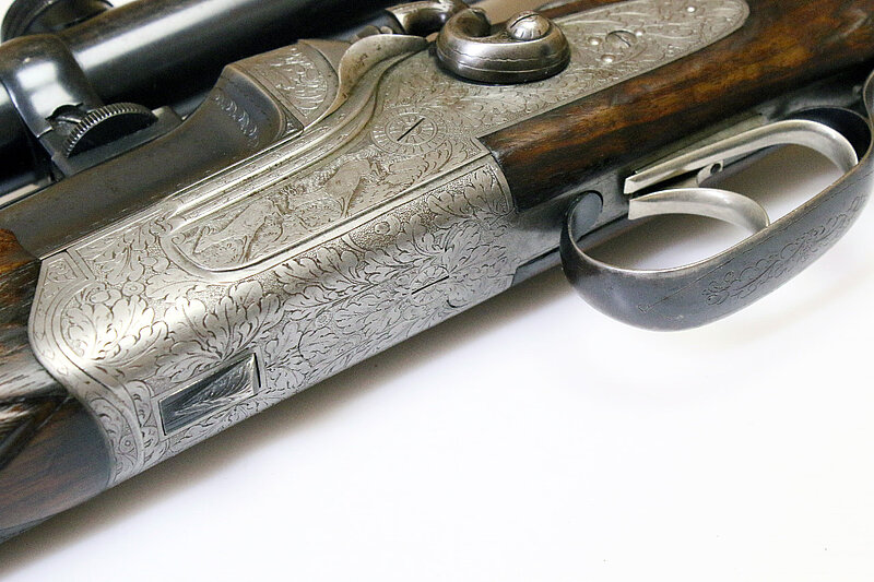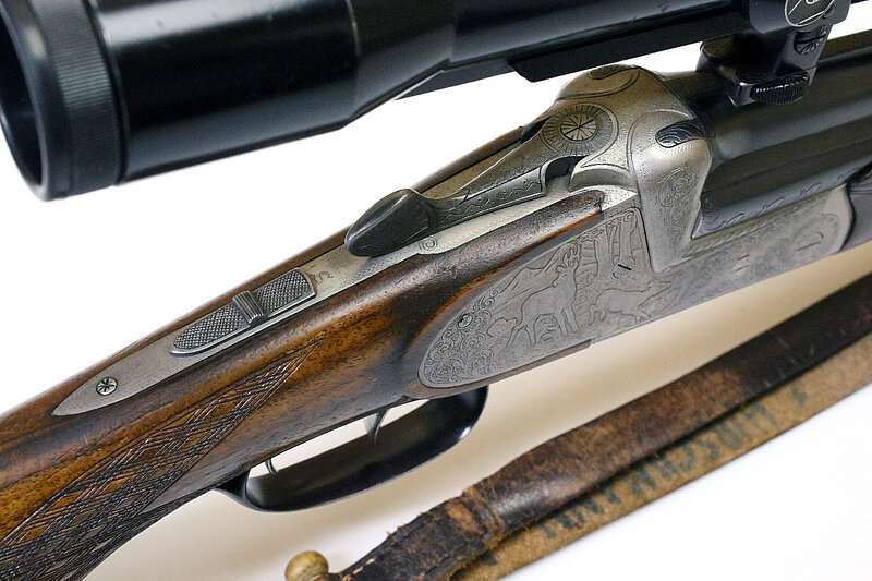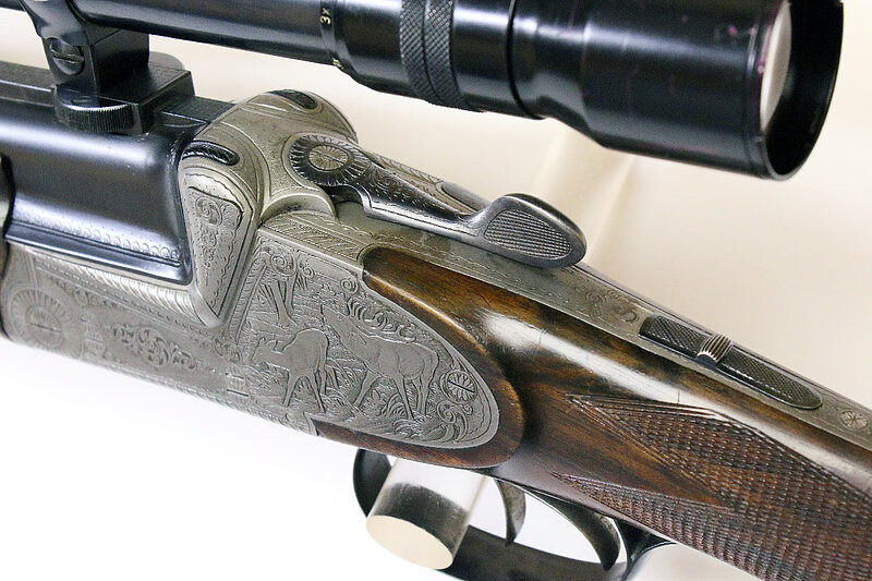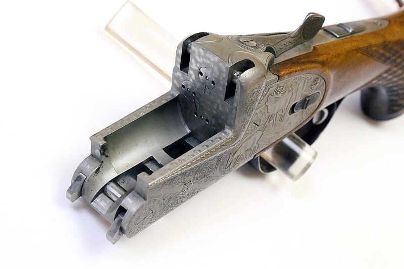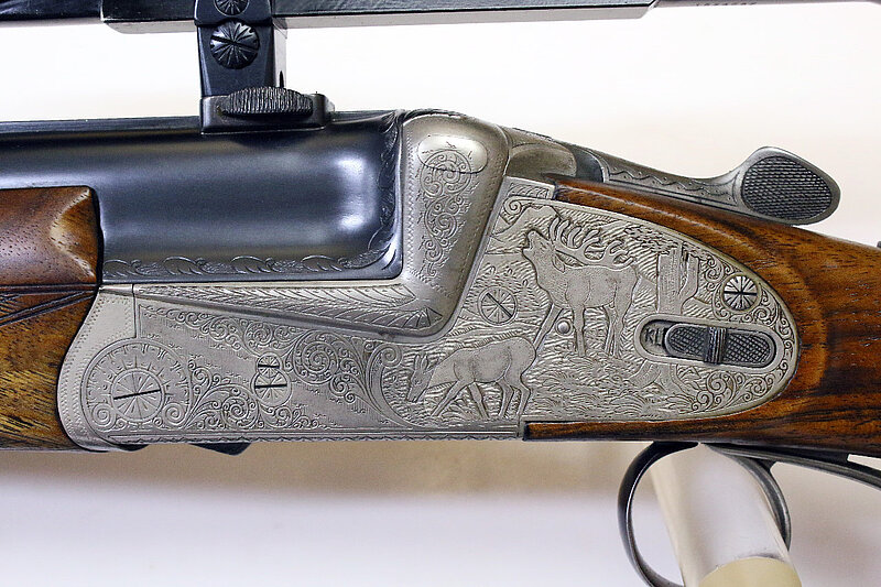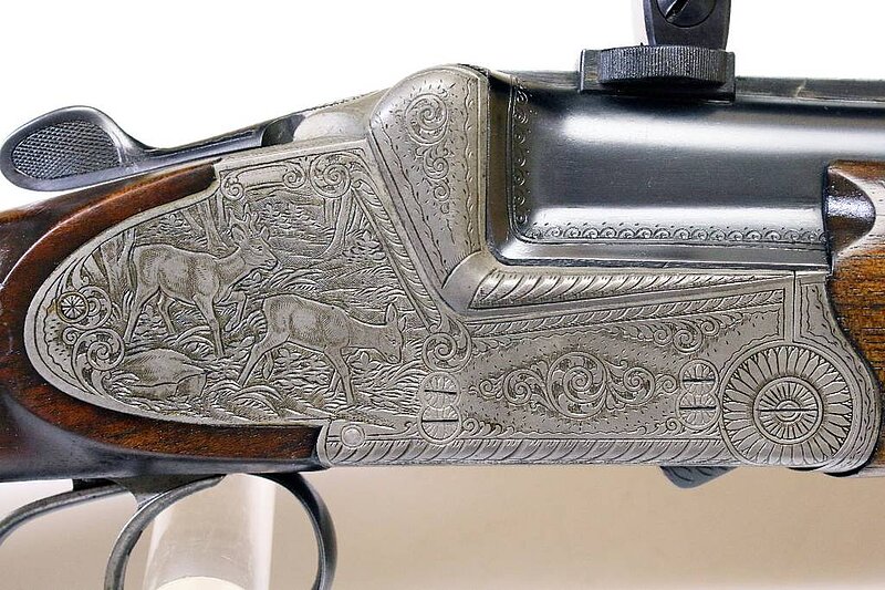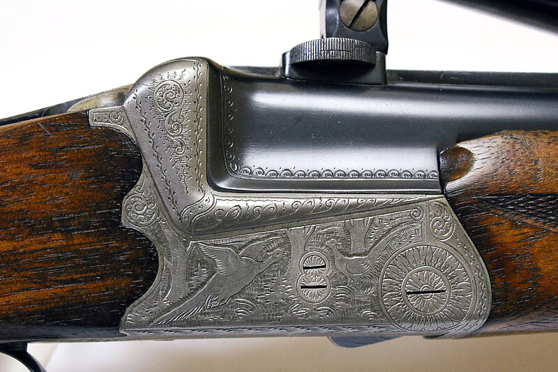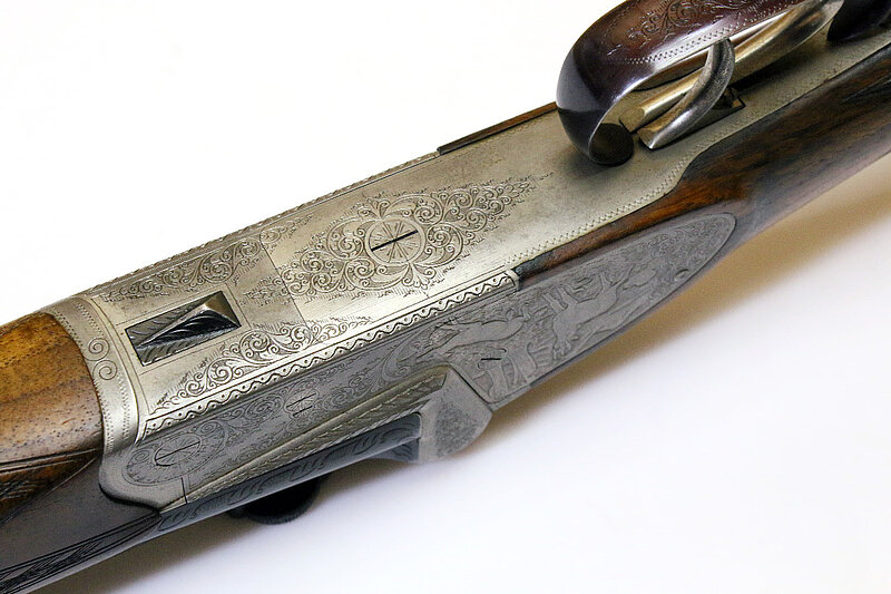 gebeizte Stahlbasküle mit langen Zierseitenplatten, auf den Seitenplatten große Wildstücke (Reh & Bock, röhrender Hirsch & Reh) flächendeckend umrahmt Arabesken/Rocaillen; Kolbenhalssicherung, Kugellauf-Selektion links auf der Seitenplatte; Kerstenverschluss mit Doppelhakenverriegelung