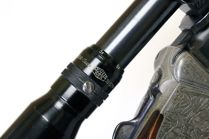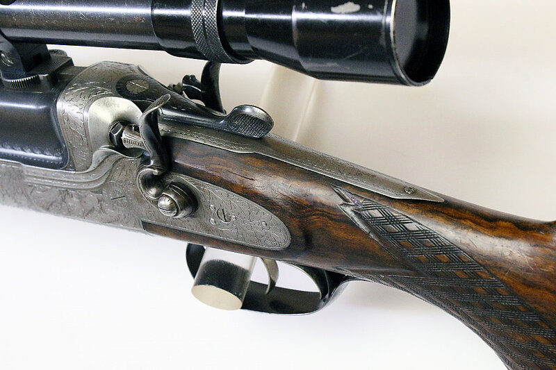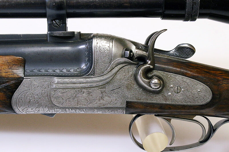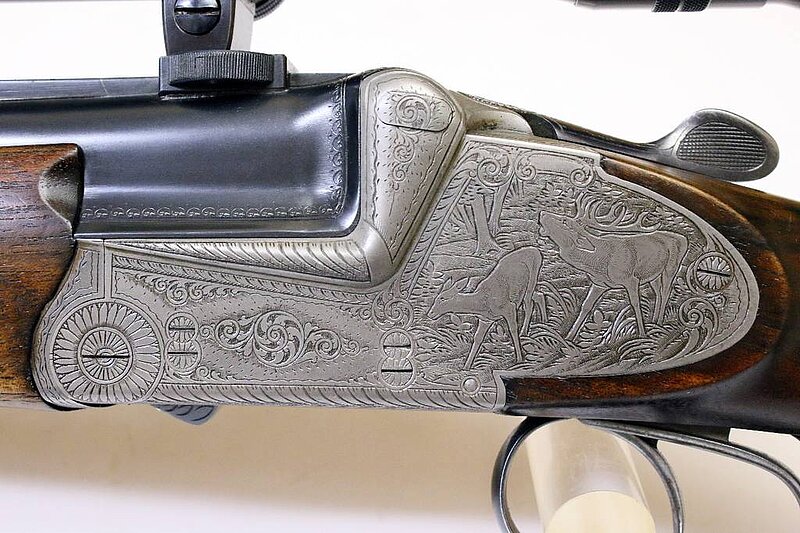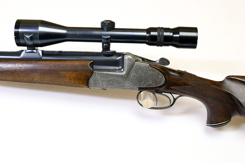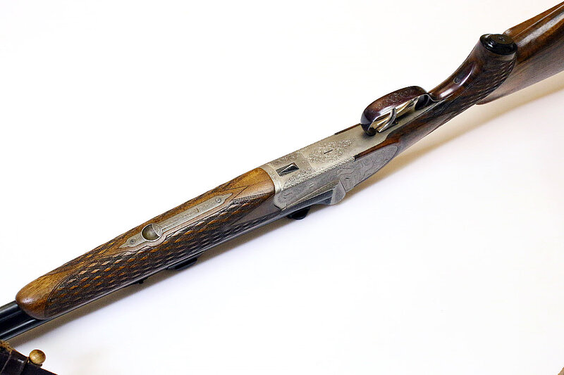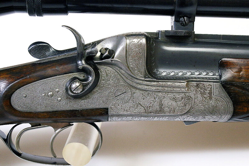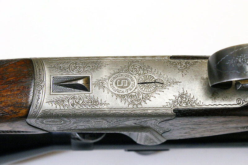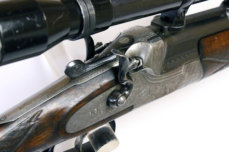 gebeizte Stahlbasküle mit langen Zierseitenplatten, auf den Seitenplatten große Wildstücke (Reh & Bock, röhrender Hirsch & Reh) flächendeckend umrahmt Arabesken/Rocaillen; Kolbenhalssicherung, Kugellauf-Selektion links auf der Seitenplatte; Kerstenverschluss mit Doppelhakenverriegelung