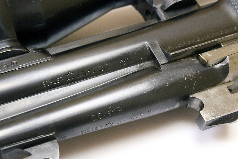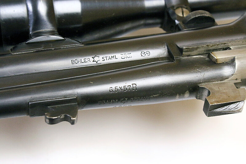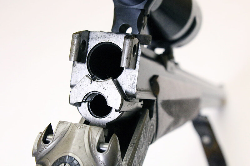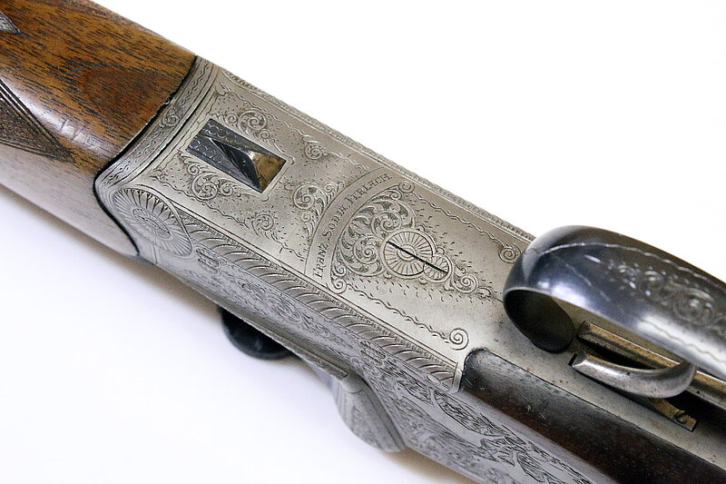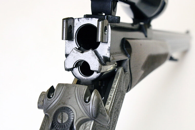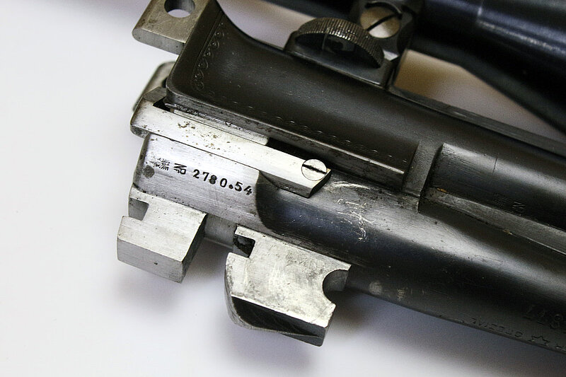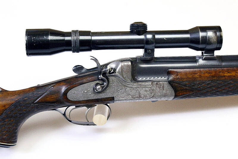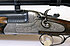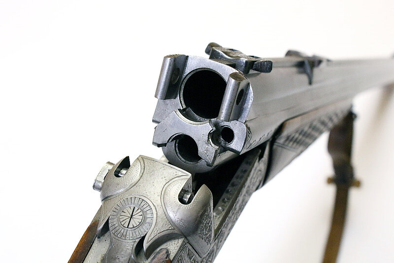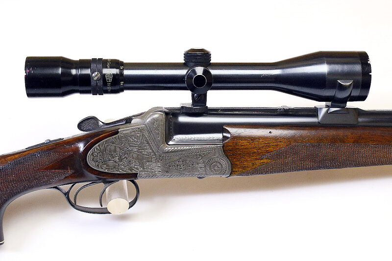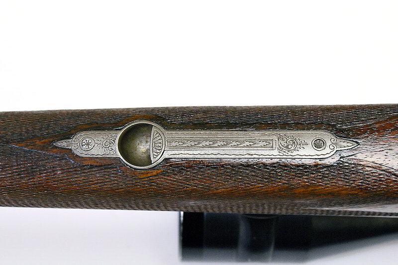 gebeizte Stahlbasküle mit langen Zierseitenplatten, auf den Seitenplatten große Wildstücke (Reh & Bock, röhrender Hirsch & Reh) flächendeckend umrahmt Arabesken/Rocaillen; Kolbenhalssicherung, Kugellauf-Selektion links auf der Seitenplatte; Kerstenverschluss mit Doppelhakenverriegelung