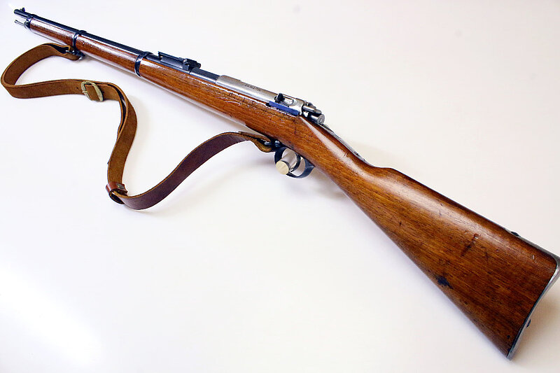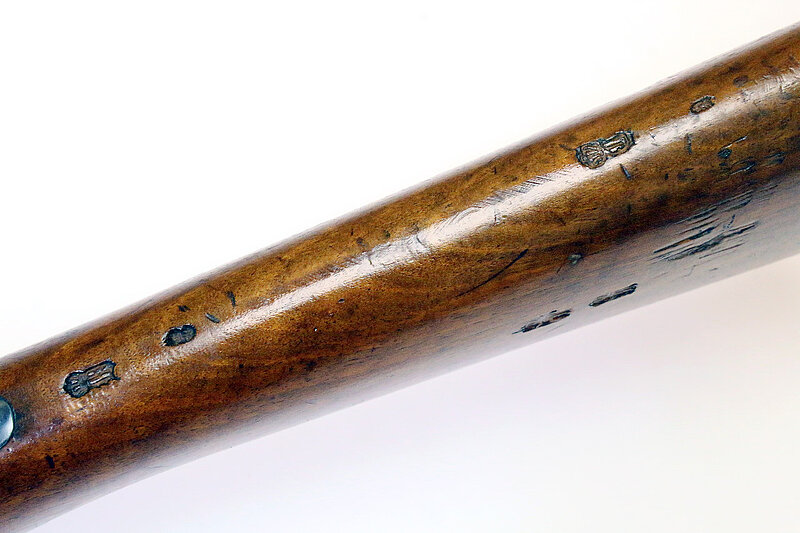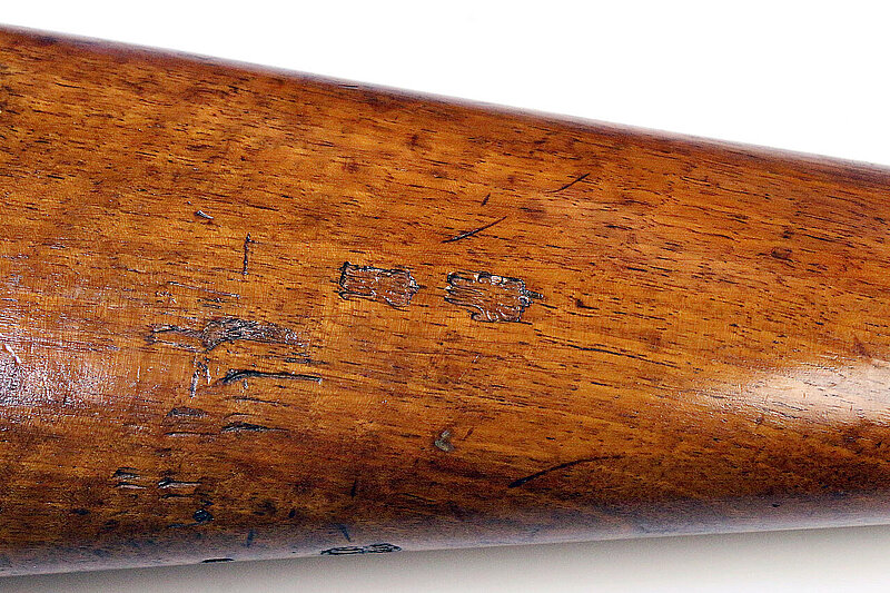zeitgenössischer dunkler Nussholzschaft mit noch erkennbaren Resten div. Prägungen kaiserlicher Abnahmen, originaler Trageriemen