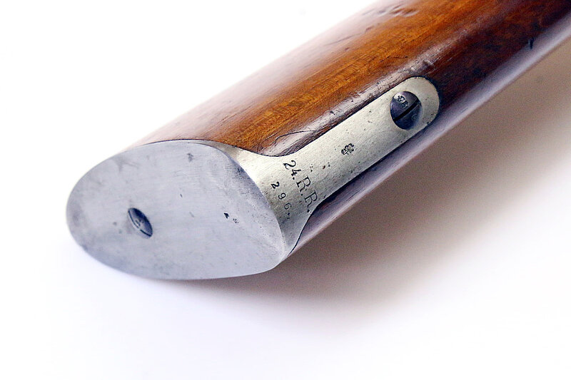 originaler Nussholzschaft mit teils sehr schön erhaltenen kaiserlichen Prägungen (siehe Fotos), Trageriemen, Schaftkappe am Nasenteil mit Truppenstempel "24.R.R.262." > Ersatz-Bataillon des Infanterie-Regiment „Großherzog Friedrich Franz II. von Mecklenburg-Schwerin“ (4. Brandenburgisches) Nr. 24, Waffe Nr. 262