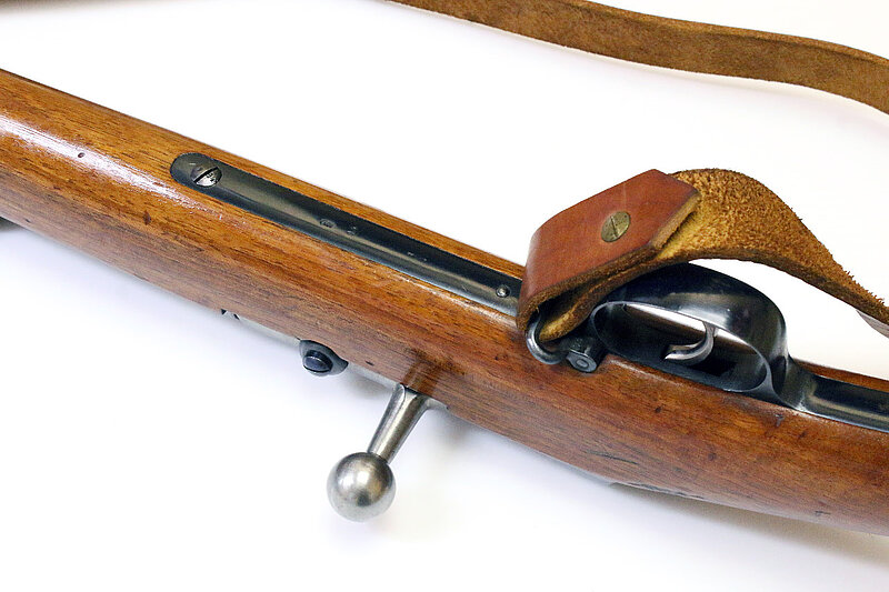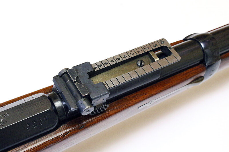 Visierung in arabischen Zahlen skaliert 5-20 (4 vorne auf Kimme noch in Druckschrift), eingeschobenes Korn