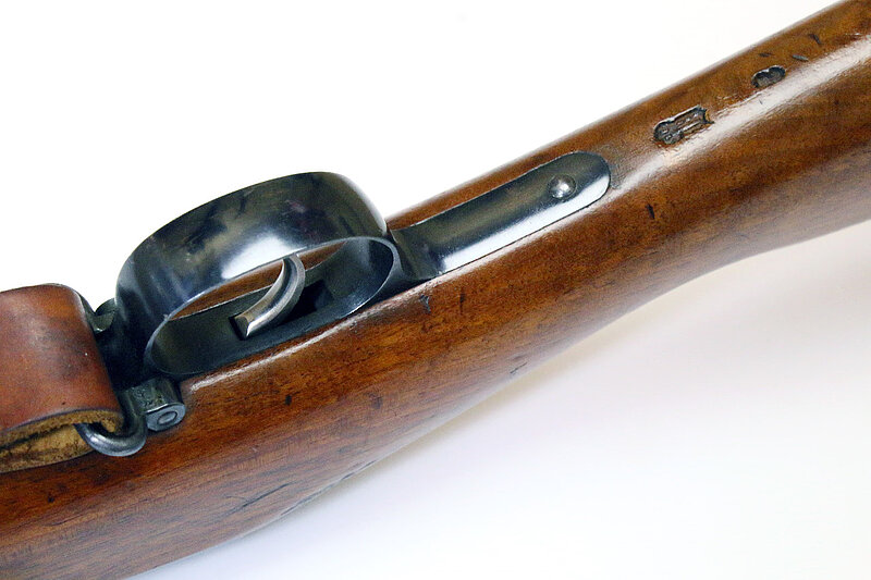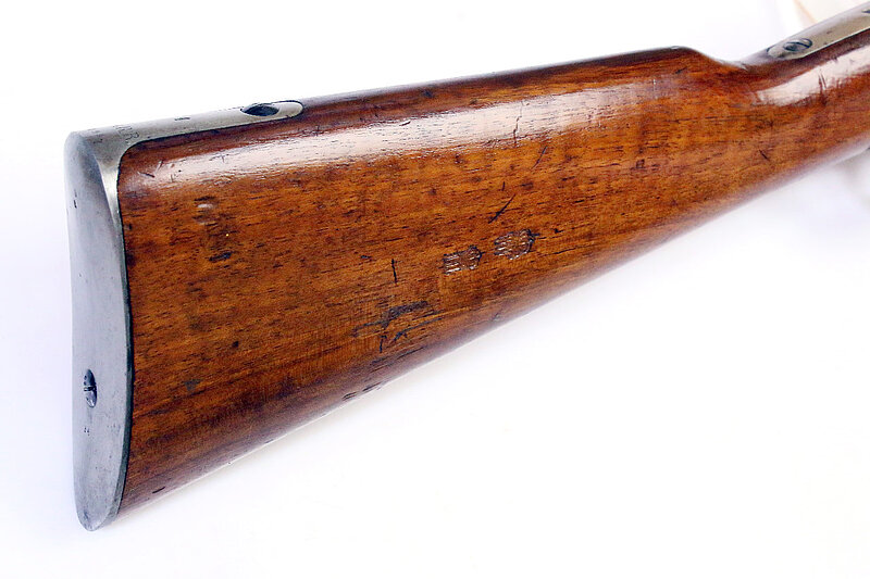 originaler Nussholzschaft mit perfekt erhaltenen kaiserliche Prägungen (siehe Fotos), Riemenbügel, Schaftkappe am Nasenteil mit Truppenstempel "K.A.R.E.2.87." > Kaiser Alexander Garde-Grenadier Regiment Nr. 1, 2. Eskadron oder Ersatzkompanie, Waffe Nr. 87