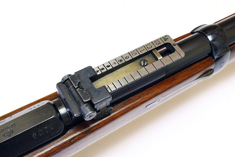 Tangentenvisierung skaliert 1-20 (gest. S/42G > Mauser, Abnahmestempel des Wehrmachts-Waffenamtes "K/167"; ebenfalls auf Sockel; Schweißpunkt bei 300m), eingeschobenes Korn