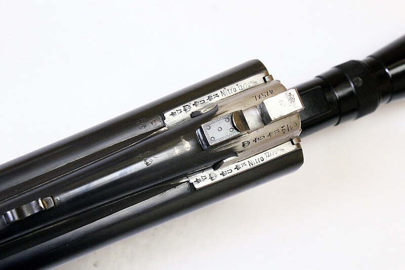 Stahlbasküle mit einfachen Arabesken/Rocaillen/Mustern graviert, Unterseite Logo des VEB Thälmann IFA-Kombinats, Laufselektion am Kolbenhals, Sicherung linksseitig, Spannanzeiger für alle 3 Läufe um Verschlusshebel angeordnet, Greener-Verschluss mit Doppelhakenverriegelung, Rückstecher